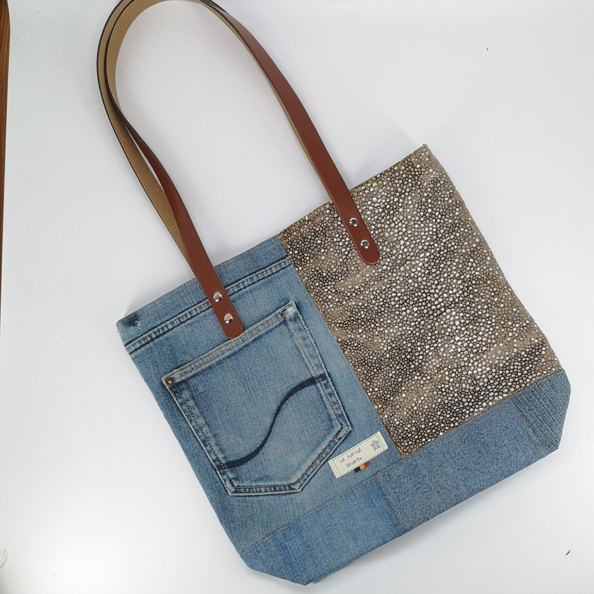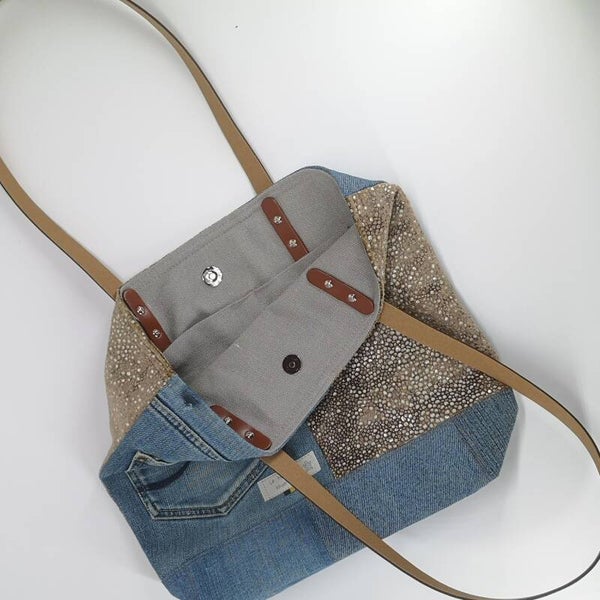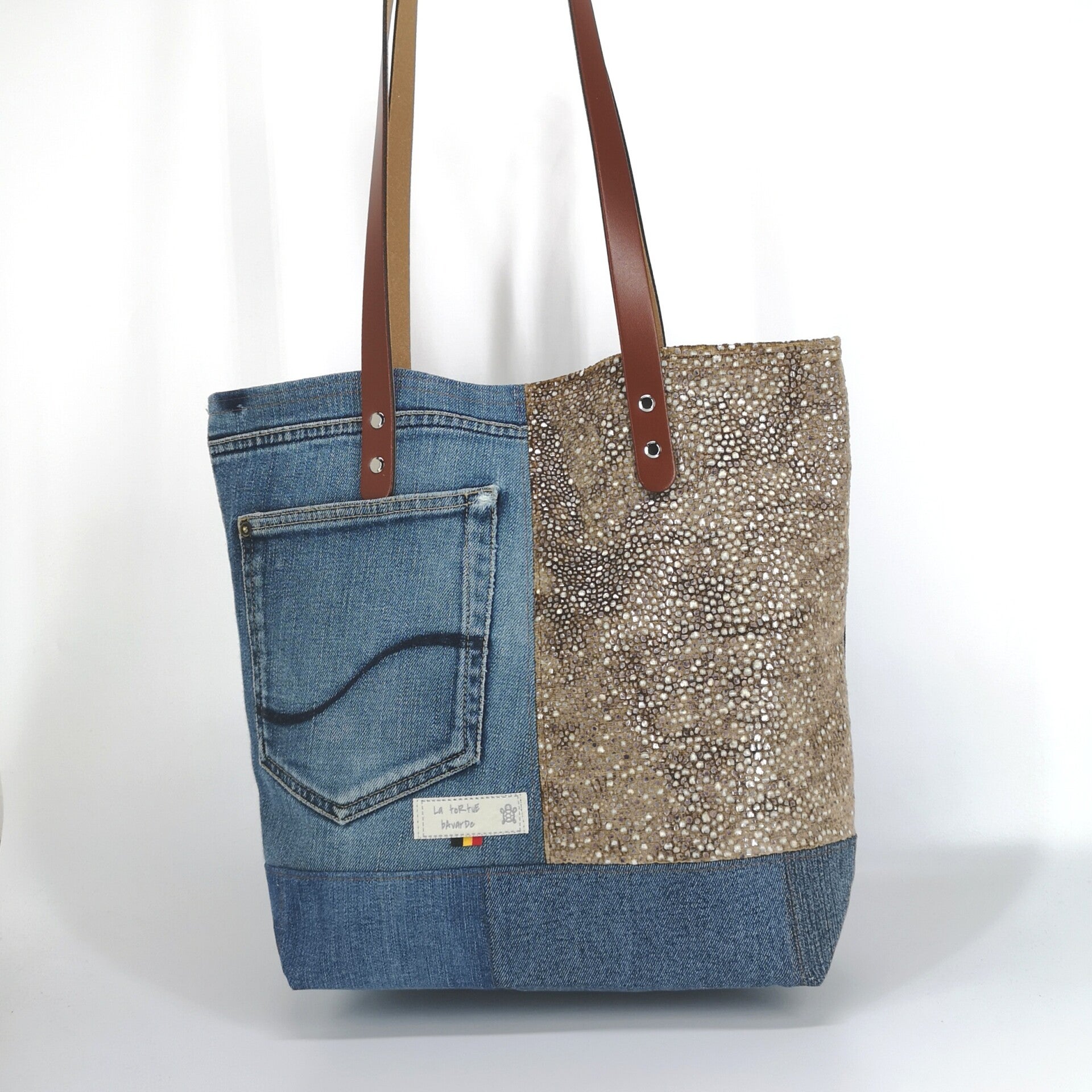 Je suis un joli cabas entoilé bi matière en tissu d'ameublement et jeans doublé de coton.
