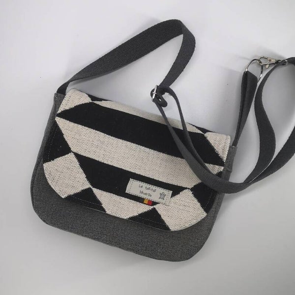 Je suis un joli sac à main entoilée bi matière : tapisserie pour le rabas, jeans et coton pour la doublure.