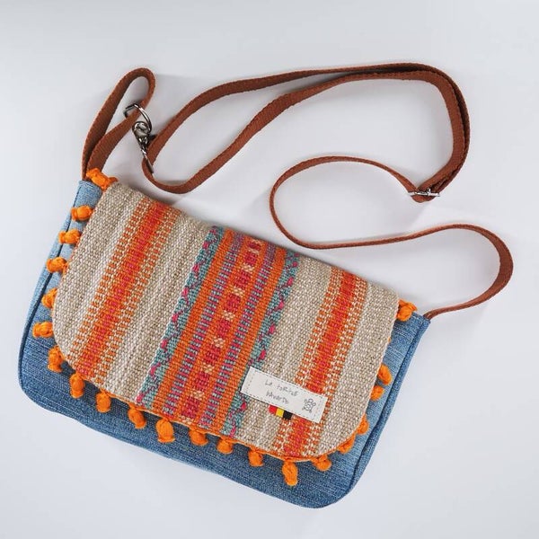Je suis un joli sac à main entoilée bi matière : tapisserie pour le rabas, jeans et coton pour la doublure.