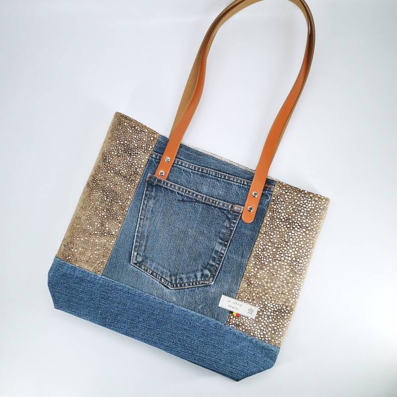 Je suis un joli cabas entoilé bi matière en tissu d'ameublement et jeans doublé de coton.